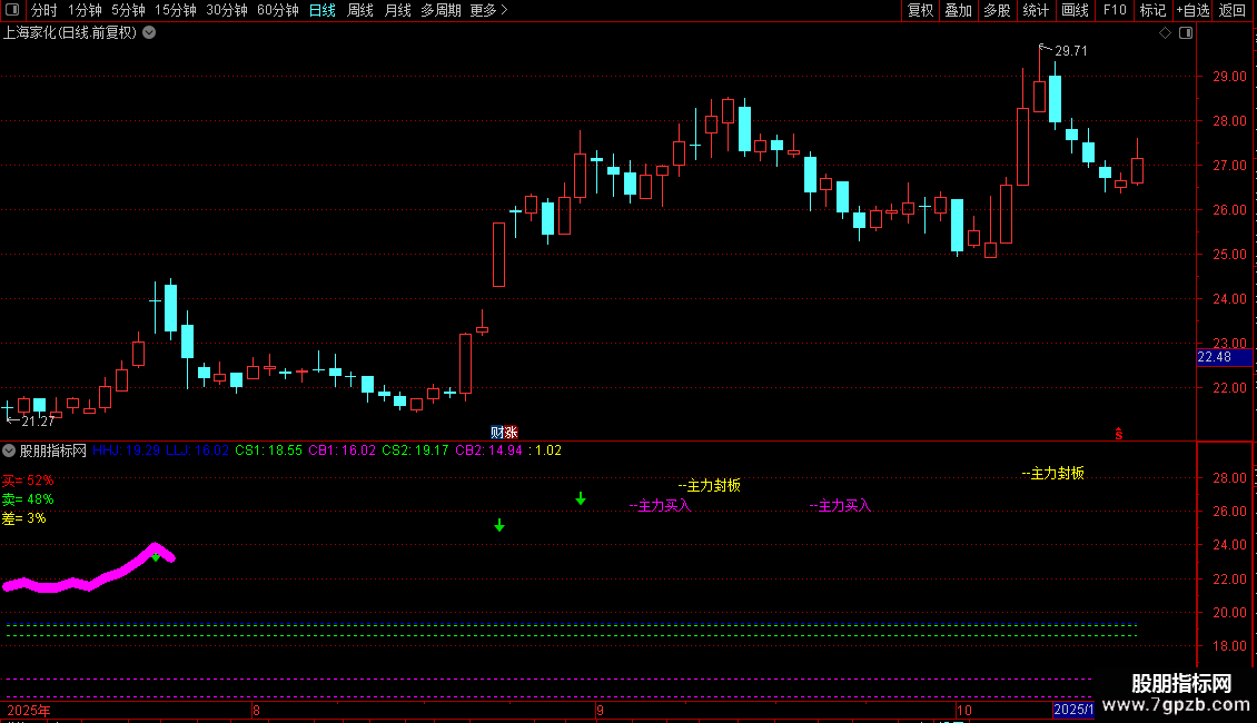 当满足条件牛股启动上穿主力抄底时,在收盘价位置画25号图标