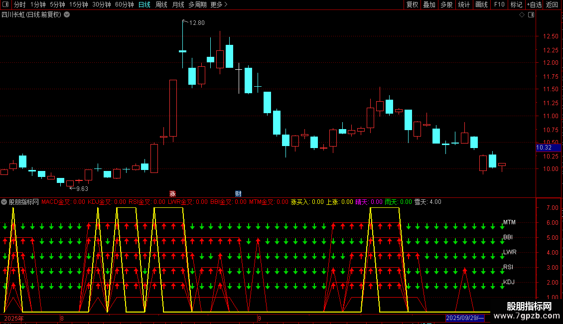 上涨:IF(A1 AND A2 AND A3 AND A4 AND A5 AND A6,7,0),COLORYELLOW,LINETHICK2;