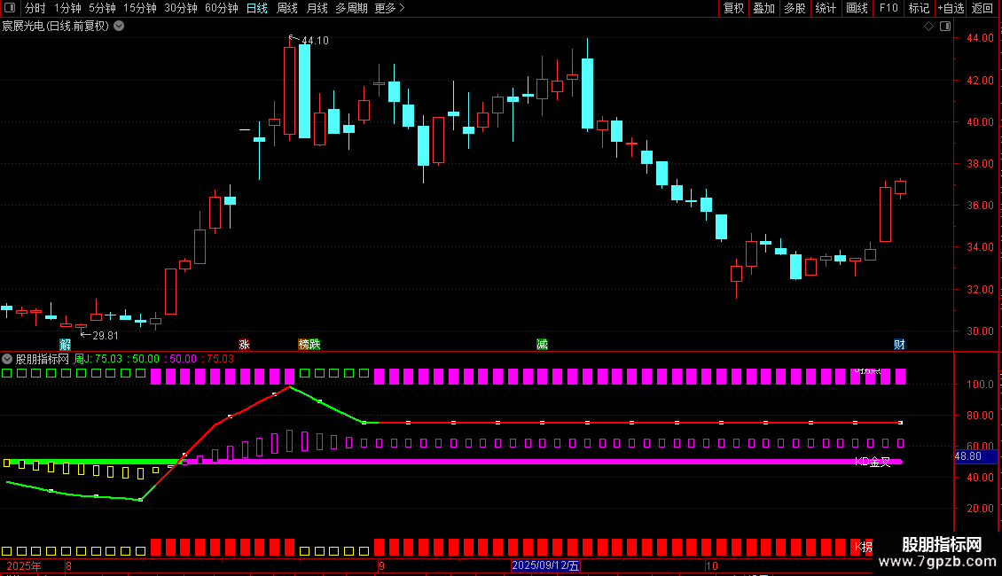 周J:MA("KDJ.J#WEEK"(9,3,3) ,5),COLOR00FF00,LINETHICK2;