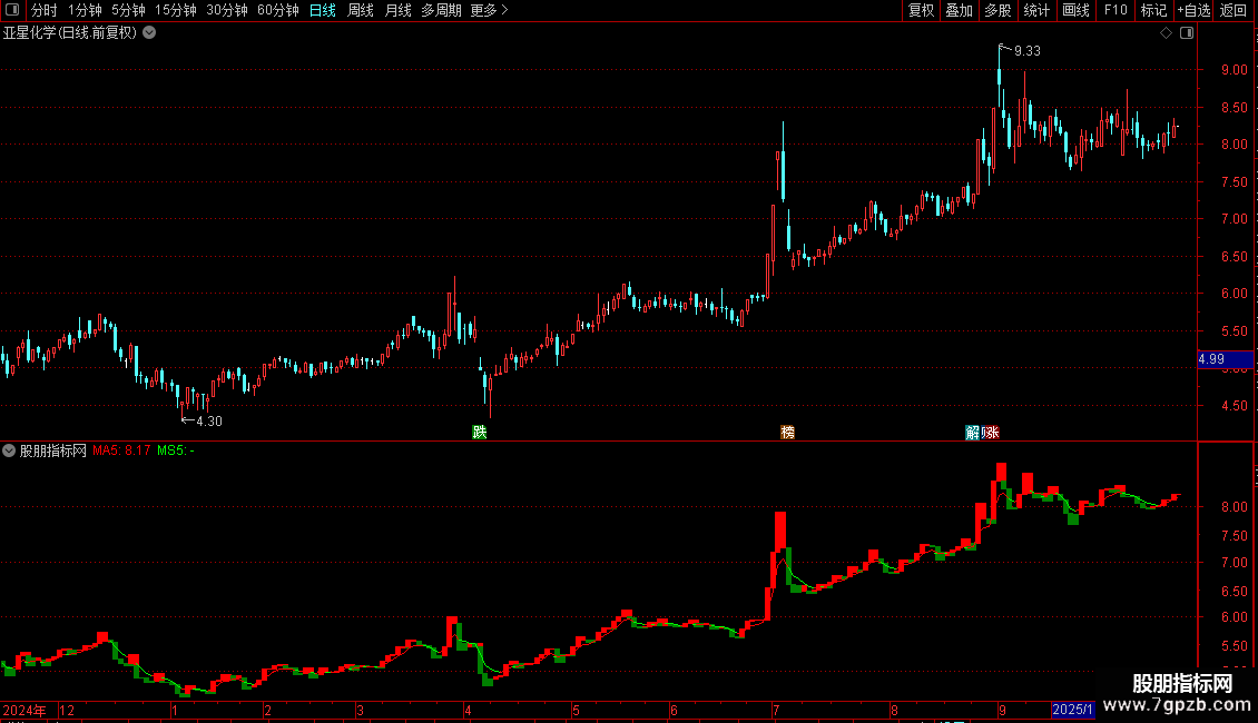MS5:IF(MA5<REF(MA5,1),MA5,DRAWNULL),COLORGREEN;
