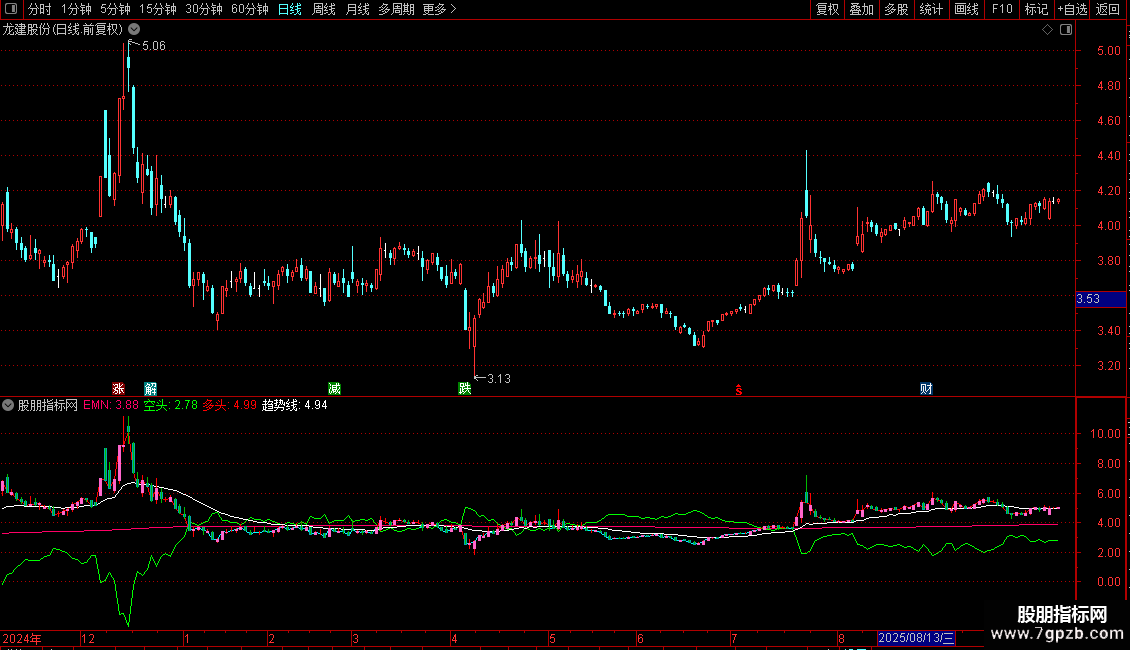 趋势线:IF(进出线<FS,FS,进出线),COLORWHITE;