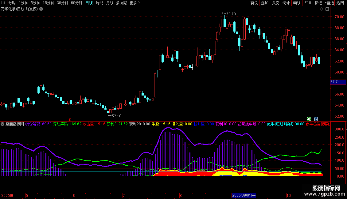 当满足条件获利30>20时,在超级疯牛股和0位置之间画柱状线,宽度为3.5,0不为0则画空心柱.,COLORFF00FF,线宽为3