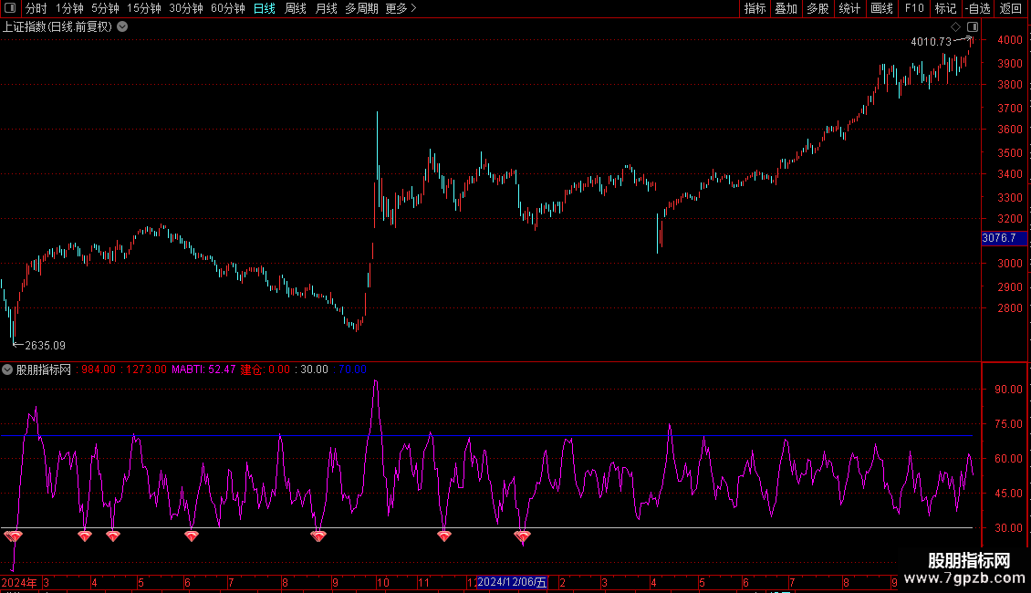 M:=5; ADVANCE,COLORRED,NODRAW; DECLINE,COLORRED,NODRAW; BTIQ:=100*ADVANCE/(ADVANCE+DECLINE); MABTI:MA(BTIQ,M); 建仓:MABTI<30,COLORRED,NODRAW; DRAWICON(建仓,30*0.99,25); 30;70;