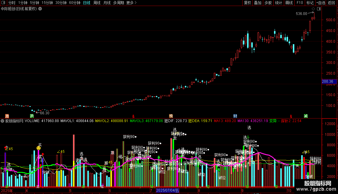变异:IF(MA(X1,13)>MA(X1,5),MA(VOL,13),DRAWNULL),COLOR00FF00,LINETHICK3;