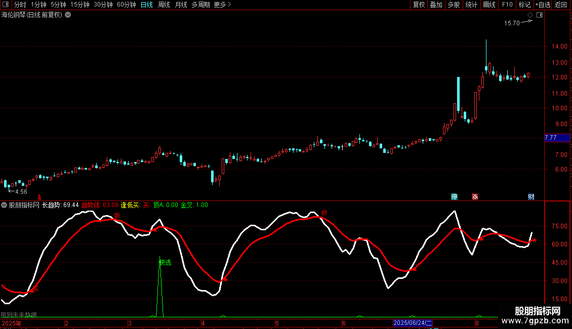 逢低买: DRAWTEXT(REF(CROSS(趋势线,长趋势),82) AND 趋势线>1.3*长趋势,长趋势,'逢低买'),COLOR00FFFF, LINETHICK1;