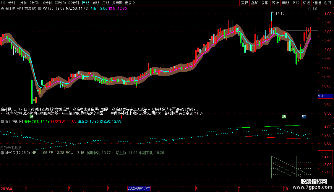 DRAWTEXT_FIX(ISLASTBAR,0,0.92,0,'泊砂提示:1、日K线对降△边线的突破后并上穿箱中或者箱顶,如是上穿箱底要等第二天或第三天持续确认不再跌破趋势线,.'),COLORWHITE;