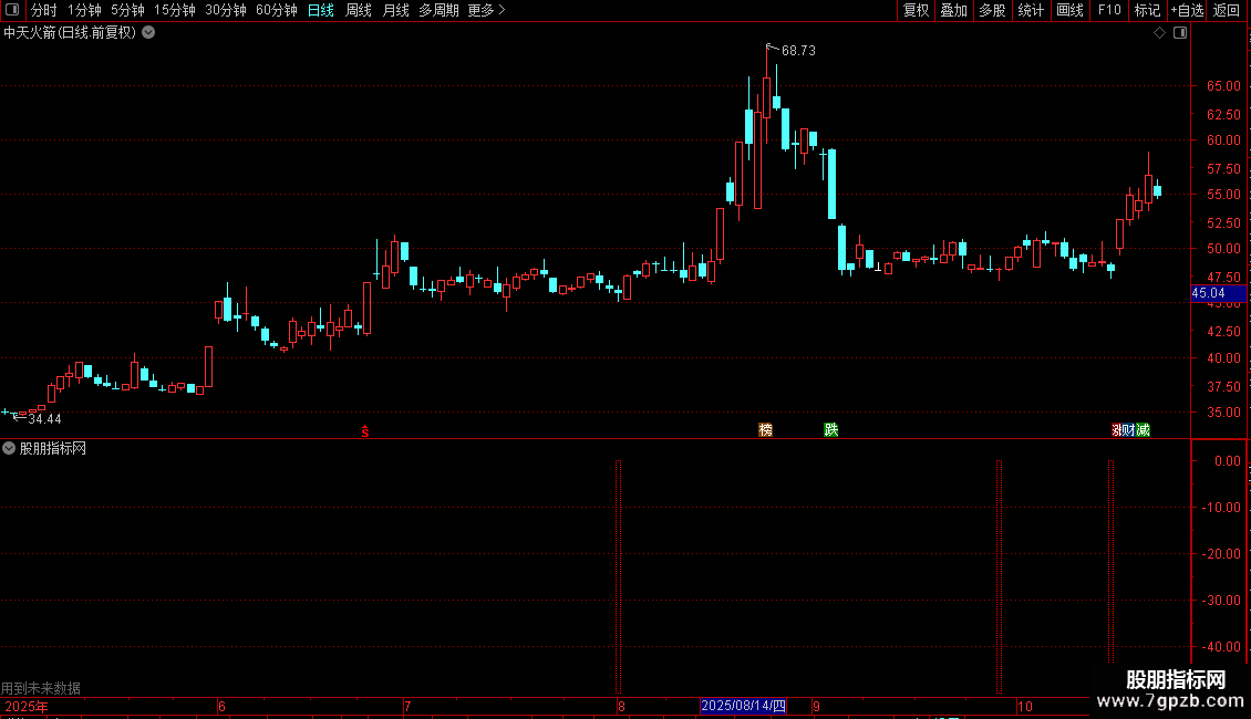 堪称一绝:STICKLINE(REF(TJ,1)=0 AND TJ>=1 AND CCI<-40 ,0,-50,1,-1),COLORRED;