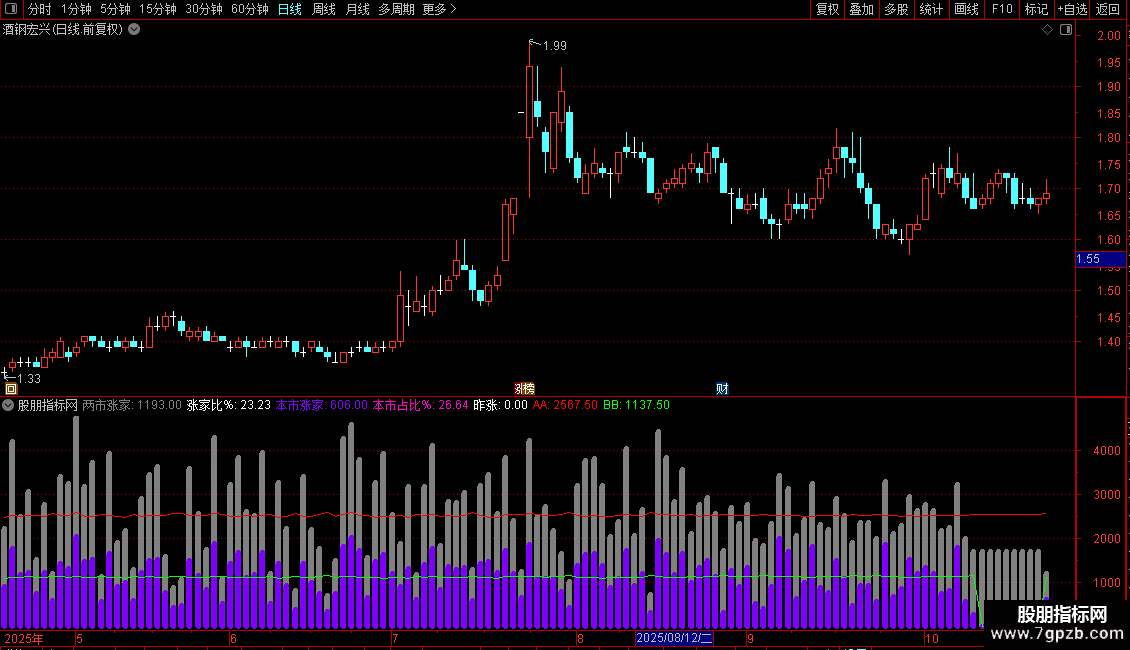 本市占比%:INDEXADV/(INDEXADV+INDEXDEC)*100,COLORCC00FF,NODRAW;