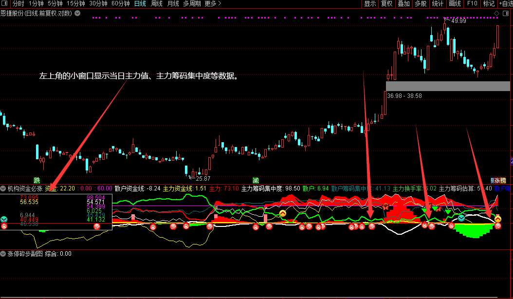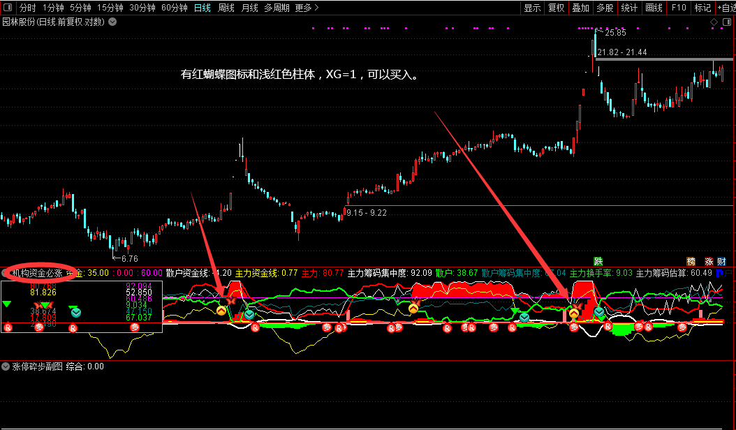主力与散户资金线、主力与散户筹码集中度和主力与散户筹码估算这三组数据,无论是看盘复盘,还是确定买入点,都具有重要的参考价值。有蝴蝶图标和浅红色柱体,且XG=1,可以买入。