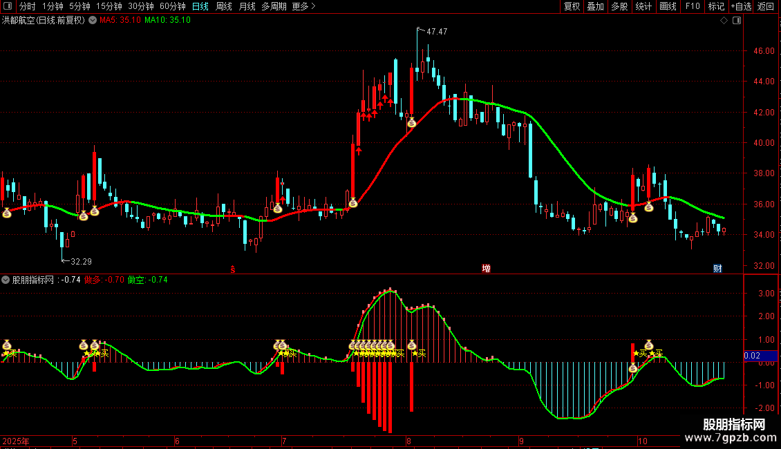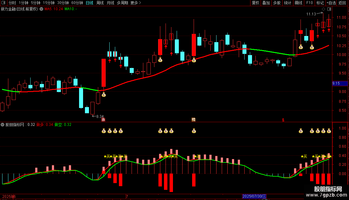 2.当副图红色量能柱与钱袋子图标形成共振,即为趋势启动信号确认。该组合信号可有效辅助判断趋势主升阶段,适合追求长期收益的投资者参考使用。