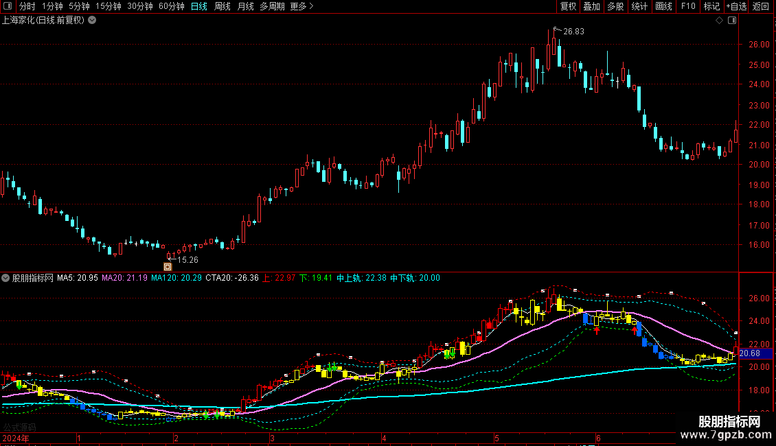 上:MA20+2*STD(CLOSE,20),COLOR0000FF,DOTLINE;