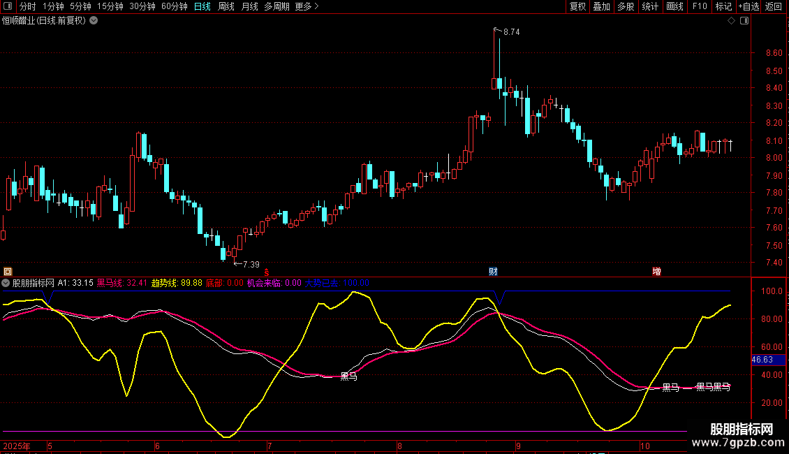 黑马线:EMA(A1,5),LINETHICK2,COLOR6600FF;