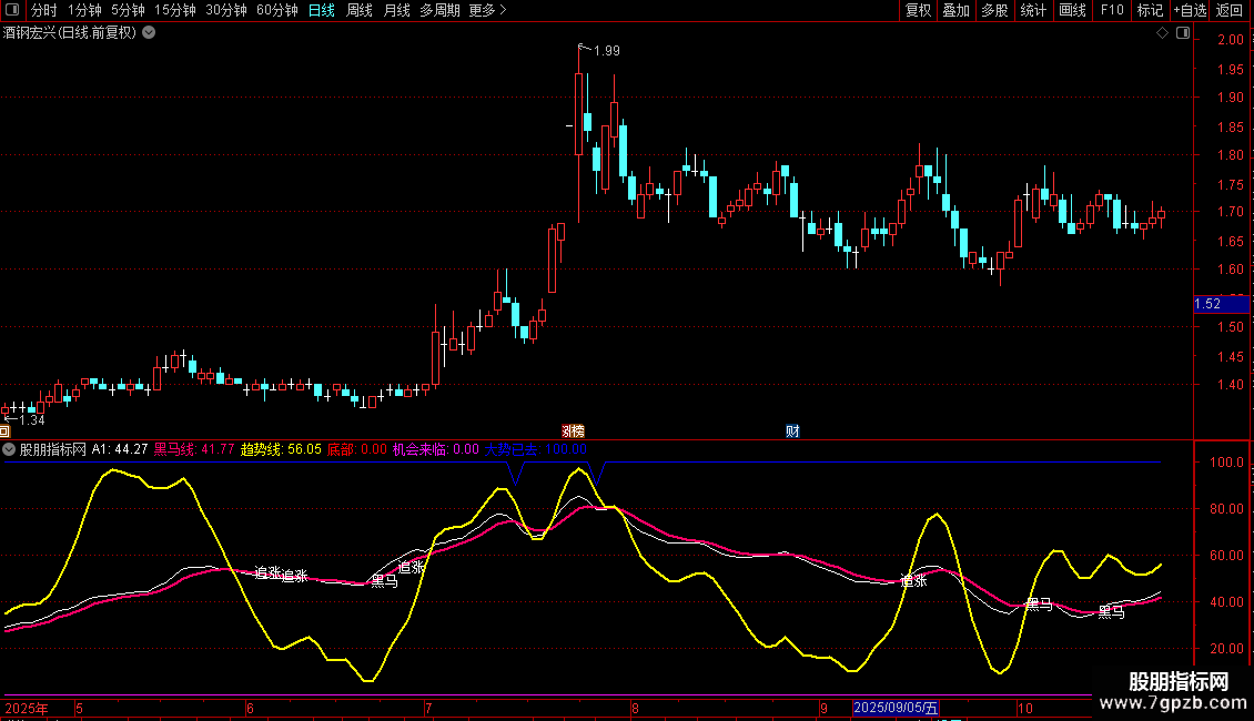 DRAWTEXT(CROSS(黑马线,A5)AND 趋势线<80,黑马线,'追涨');