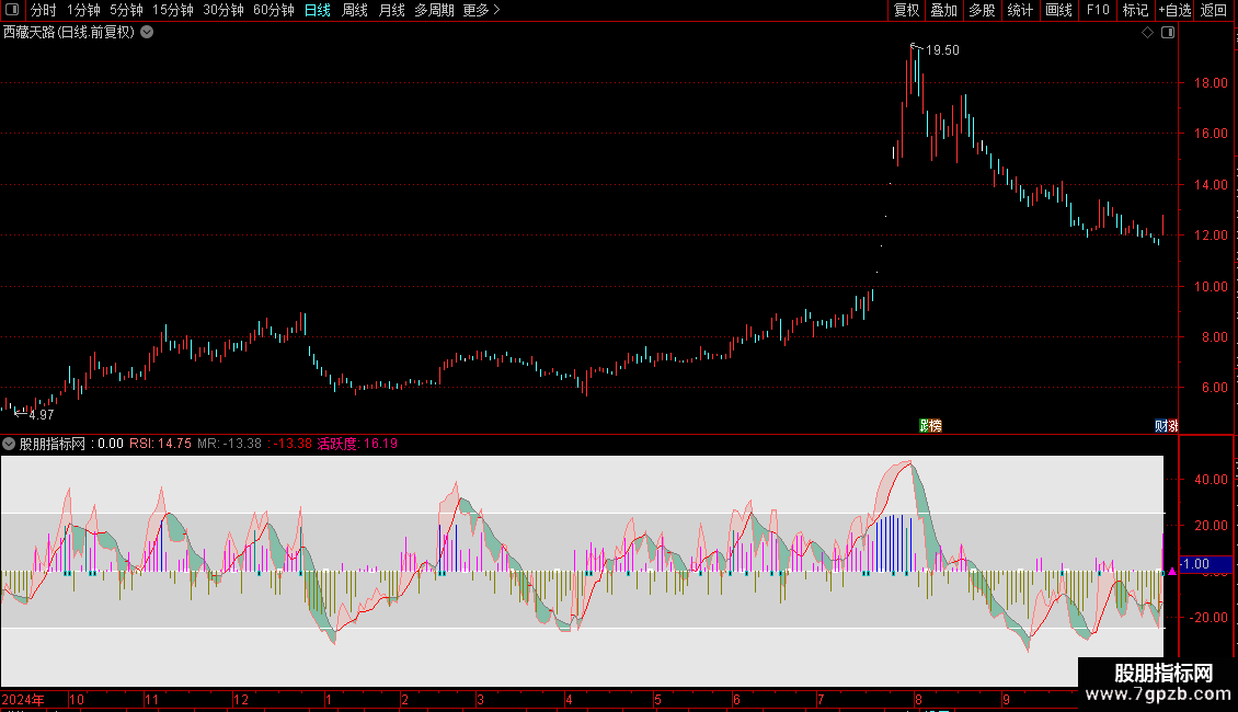 当满足条件活跃>19.5时,在0和活跃位置之间画柱状线,宽度为0,1不为0则画空心柱.,画蓝色