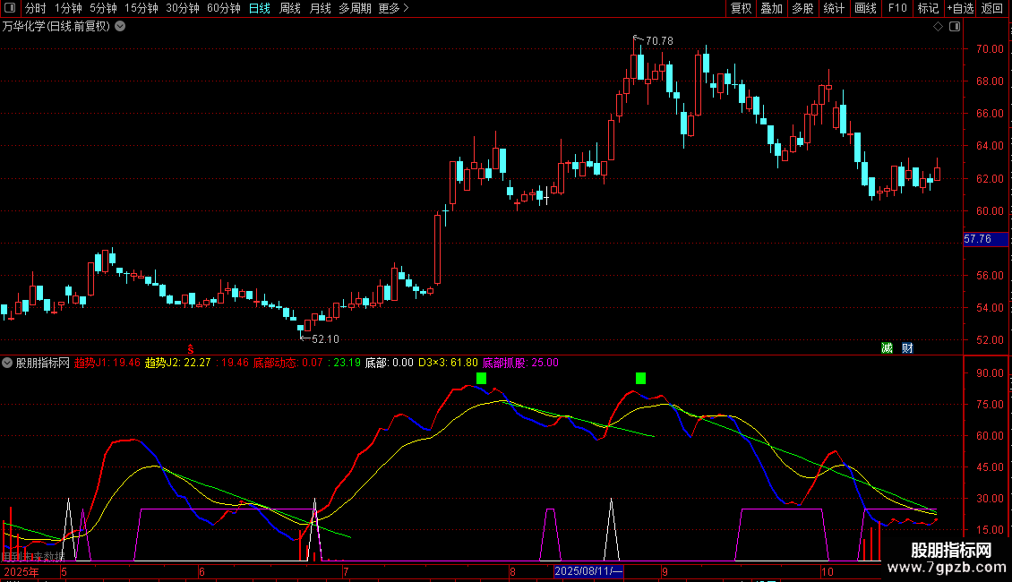 抢反弹:= IF(CROSS(K,D) AND BBIAS<-6 AND D<16 AND CLOSE>REF(CLOSE,1),80,0),COLOR00FF00;