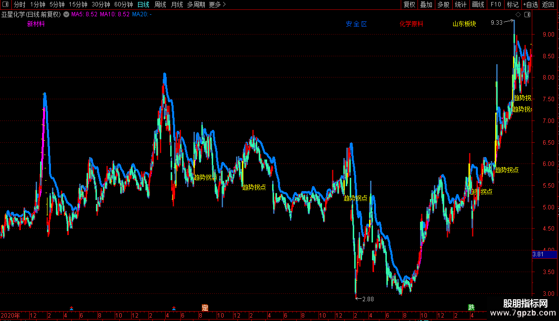 使用该指标时,可遵循以下要点:当趋势线由蓝转紫且股价上穿趋势线时,可视为买入信号;当出现“趋势拐点”提示并伴随放量,往往是加仓时机;而当趋势线由紫转蓝且股价跌破趋势线时,则应考虑卖出或减仓。