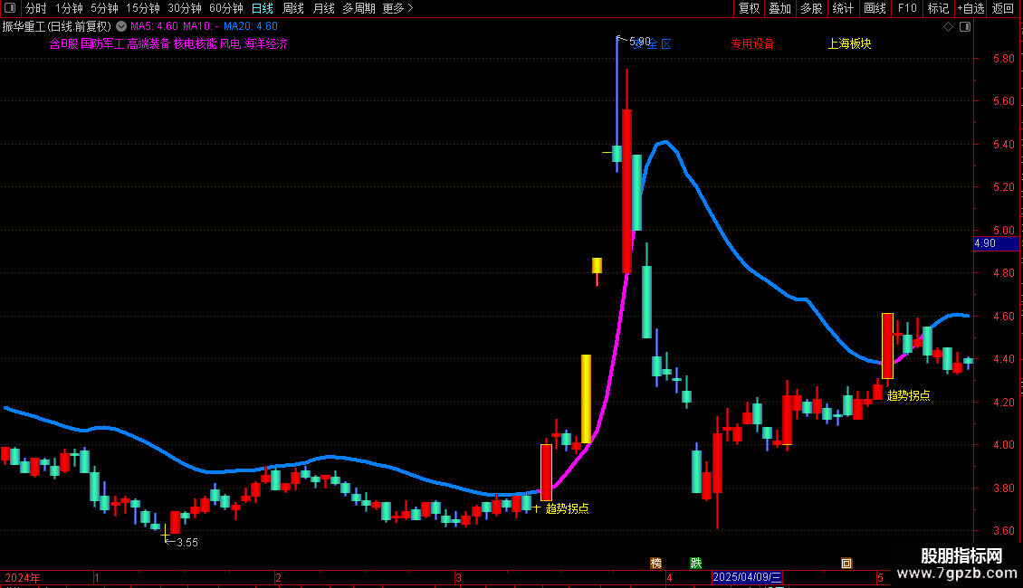 指标特别设计了“趋势拐点” 提示功能。当开盘价低于WEKR线而收盘价强势上穿,并且当日涨幅超过7%时,会在K线下方标记“趋势拐点”文字,同时用黄色K线突出显示。这通常意味着强势突破的启动信号,是投资者重点关注的机会。