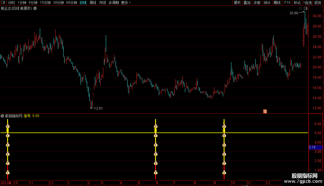 信号:IF(强势底分,6.5,5),COLORYELLOW,LINETHICK2;