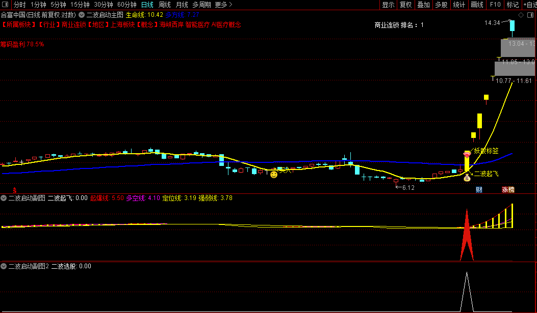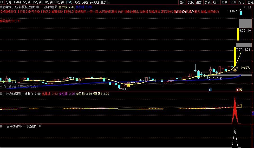 标识:K 线下方显示黄色 “↘二波起飞” 文字,搭配图标 9(通达信默认 “上升箭头”)