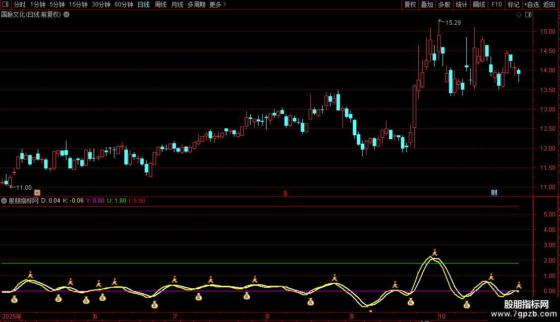 当满足条件D上穿K时,在D+0.6位置画15号图标,画绿色