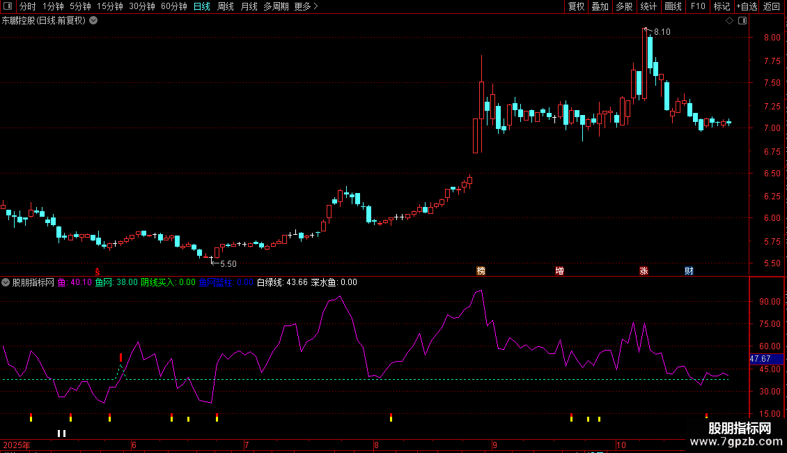白绿线:SMA(鱼,7,1),LINETHICK1,COLORWHITE,NODRAW;