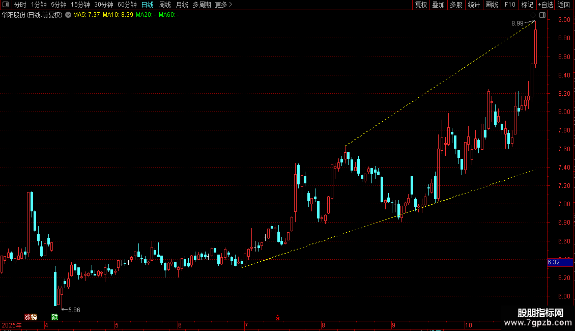 上轨:DRAWLINE(HG7=0,HIGH,HG8=0 AND HG10,HIGH,1),COLORYELLOW,DOTLINE;