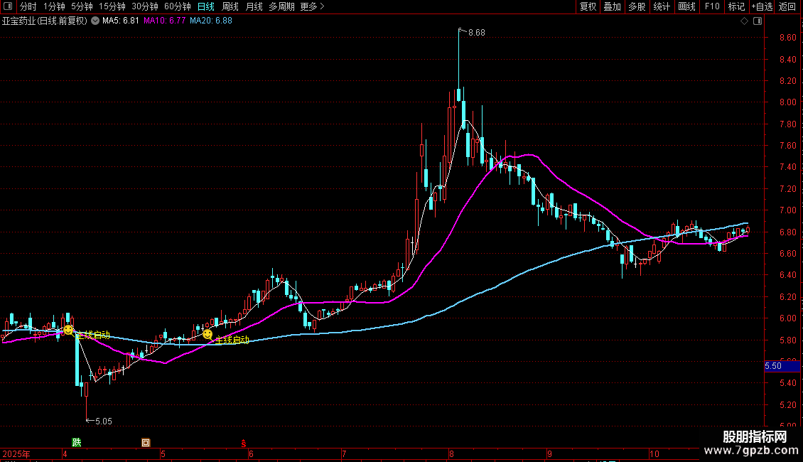 当满足条件ABC6时,在最低价-0.10位置书写文字,画黄色