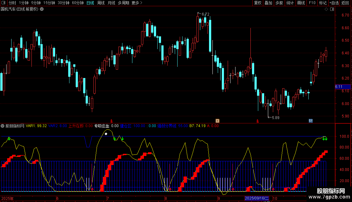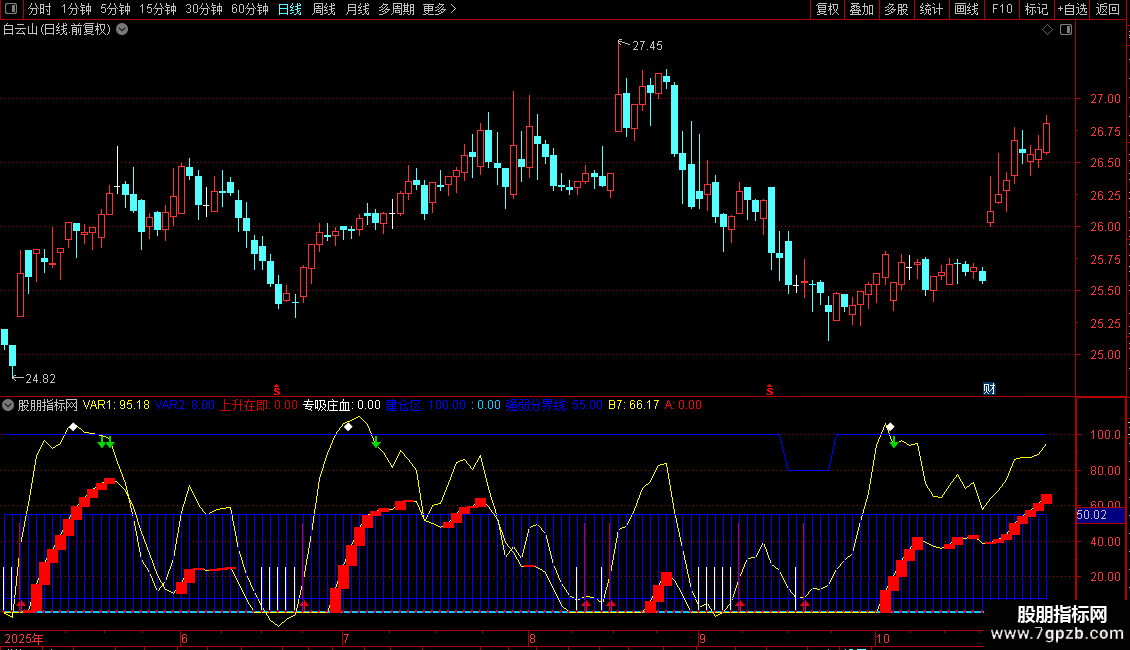 上升在即: IF(CROSS(VAR1,VAR2),50,0),STICK,COLOR0000CC,LINETHICK2;