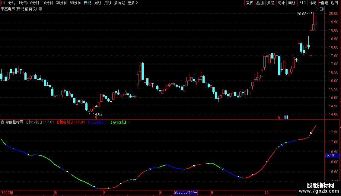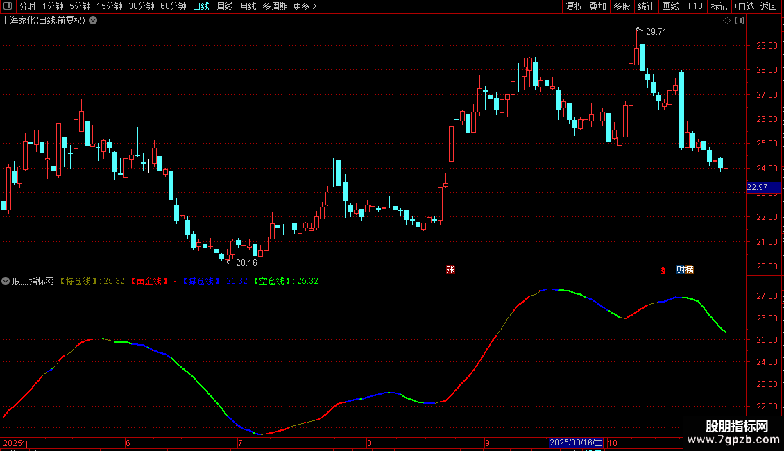 【减仓线】:IF(抛物线>C,【持仓线】,DRAWNULL),COLORBLUE,LINETHICK2;