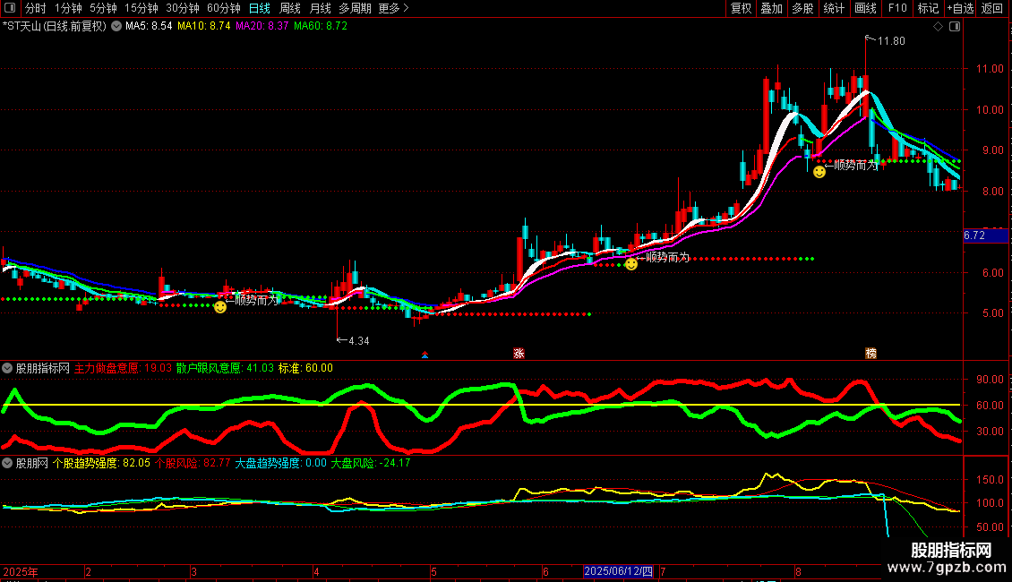个股风险:MA(FORCAST(个股趋势强度,20),6),COLORRED;