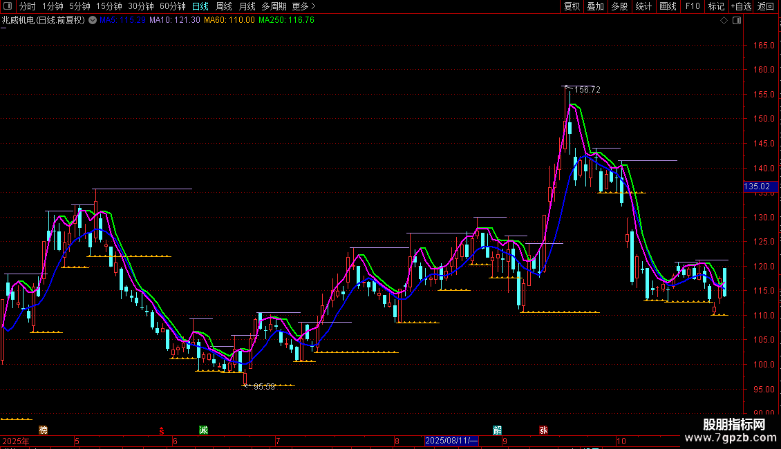 强势单线持股:LLV(MA(HIGH,(3)),1),LINETHICK2,COLORFF00FF;