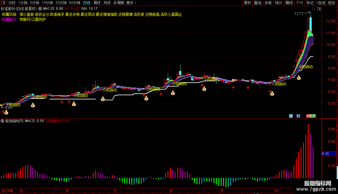 2.核心逻辑解析:主图小阳启动信号与副图红色量能柱形成双重验证。首次共振时,量能柱变红且主图出现启动信号,