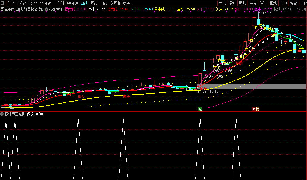 本指标包括1主图、1副图和1选股。指标是一款综合型趋势分析工具,通过多维度计算揭示价格强弱与买卖时机。其核心由操盘线、七妹线、决策线构成,分别反映短期波动、中期趋势及长期方向。当操盘线突破七妹线时呈现紫色,提示做多机会;下破时显示绿色,警示风险。指标特别设置黄金线及其衍生通道(如启动线、天王线),通过价格与通道的位置关系预判突破空间。另配备多空对比机制,当动能线穿越平衡线时,决策线颜色变化直接指示持仓策略。最后通过极值与疯牛极地标记,辅助捕捉极端行情下的反转信号。整体兼顾趋势跟踪与临界点预警,适用于动态把握波段起止。