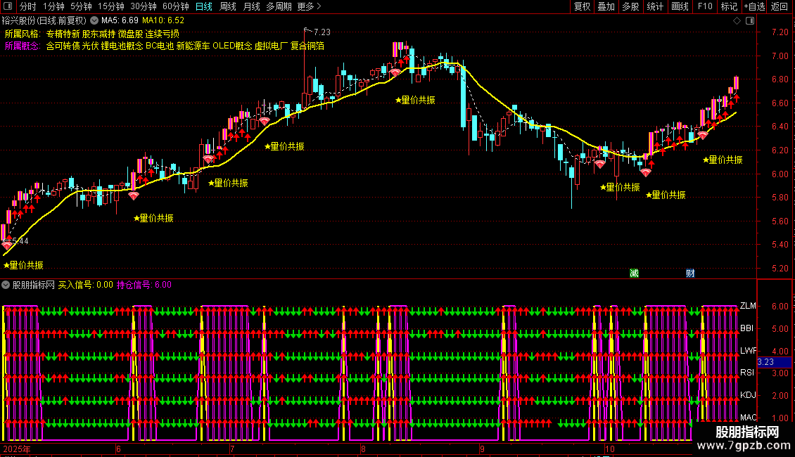 指标通过整合MACD、KDJ、RSI、LWR、BBI和动量指标,实现多指标共振判断买卖点。当所有指标同时发出金叉信号时,产生买入信号;持续满足条件则显示持仓信号。