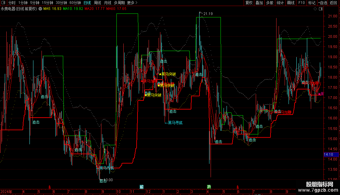 下轨道:(SMA(LOW,21,2) * 0.969),POINTDOT,COLOR00FFFF;