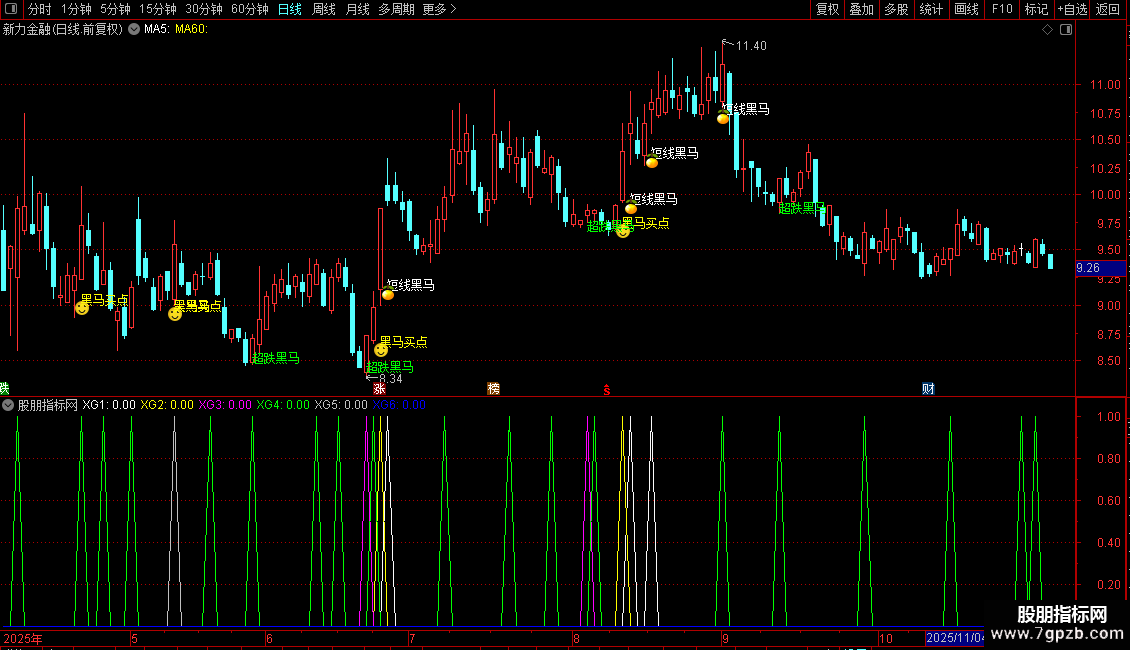 指标通过多组均线交叉、动量强度和超跌反弹信号,识别股票短期强势起涨点。当短期均线上穿中长期均线且成交量放大时提示"黑马买点";在价格超跌区域结合动量反转捕捉"超跌黑马"机会;综合量价、波动率和趋势强度筛选出"大黑马"标的。