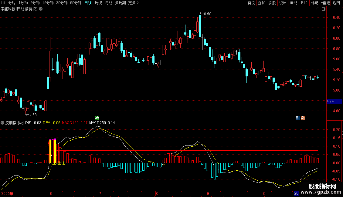 DIF:EMA(CLOSE,12)-EMA(CLOSE,25);DEA:EMA(DIF,5);MACD:=(DIF-DEA)*2;STICKLINE(MACD>0,MACD,0,3,1),COLORRED;STICKLINE(MACD<0,MACD,0,3,1),COLORCYAN;MACD120:REF(MACD/2,BARSLAST(MACD=HHV(MACD,120))),COLORRED,LINETHICK2;MACD250:REF(MACD/2,BARSLAST(MACD=HHV(MACD,250))),COLORWHITE,LINETHICK2;XG:=NOT(REF(MACD120,1)=MACD120);STICKLINE(XG,0,MACD,2,0),COLORYELLOW;STICKLINE(MACD>=MACD250,MACD250,MACD,2,0),COLORMAGENTA;大行情:=NOT(REF(MACD120,1)=REF(MACD250,1)) AND MACD120=MACD250;DRAWTEXT(XG,0,'↖金柱'),COLORYELLOW;DRAWTEXT(大行情,0,'↖大牛启动'),COLORYELLOW;