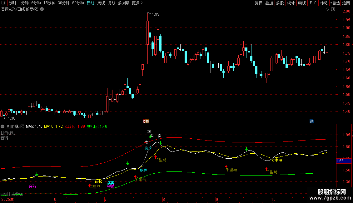 DRAWTEXT((ZIG(3,5)>REF(ZIG(3,5),1)) AND (REF(ZIG(3,5),1)<=REF(ZIG(3,5),2)) AND (REF(ZIG(3,5),2)<=REF(ZIG(3,5),3)),LOW*0.94,'千里马'),COLORBROWN;