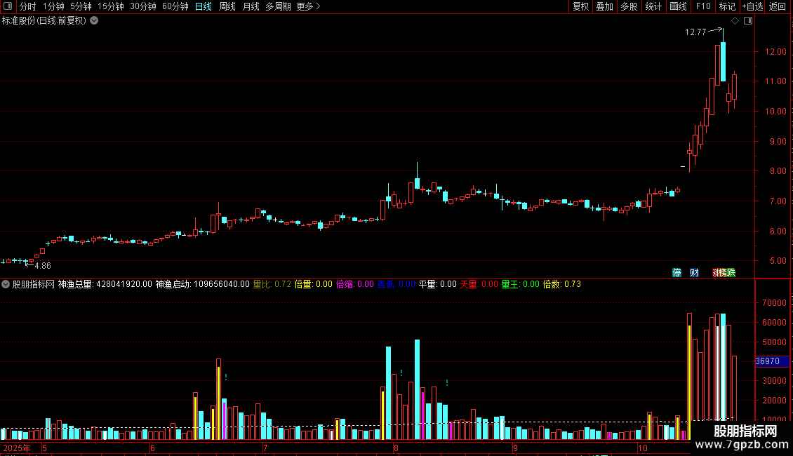 与传统的系统成交量指标比,神渔量能指标把成交量的变化规律用不同的颜色标示区分出来,并引入倍量、缩量、平量、百日低量、天量、量王的概念,使成交量的变化规律无所遁形,一目了然;传统的系统成交量指标用的是成交手数(受除权除息增发影响失真比较大),而神渔量能指标启用成交金额,更能真实的反应当天的成交情况,并弃用传统的一些指标线,独创一条动态的神渔启动线,成交量只有超过这条启动线,才有走牛的可能,这就给我们及时发现和抓住牛股、妖股提供了一个难得的契机,是量学喜爱者“攻城掠地”的必备良器。本指标参考了量学的成交量指标思路,在此表示诚挚的谢意!