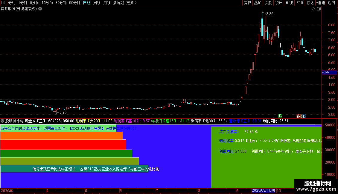 DRAWTEXT_FIX(现金流【正】>0,0,0.03,0,'当符合条件时会出现字体,说明符合条件,【经营活动现金净额】 正数越高越好理论上')COLORBLUE ;