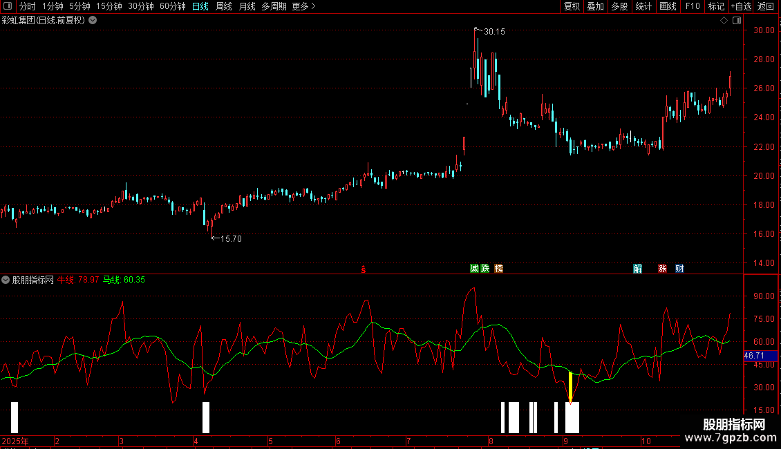牛线:SMA(MAX(CLOSE-REF(CLOSE,1),0),N,1)/SMA(ABS(CLOSE-REF(CLOSE,1)),N,1)*100,COLORRED;