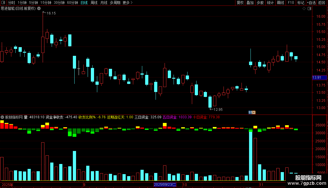 资金净收支:IF((HSL*0.4+LLJX)>0,资金流入,资金流出),COLORWHITE,POINTDOT;