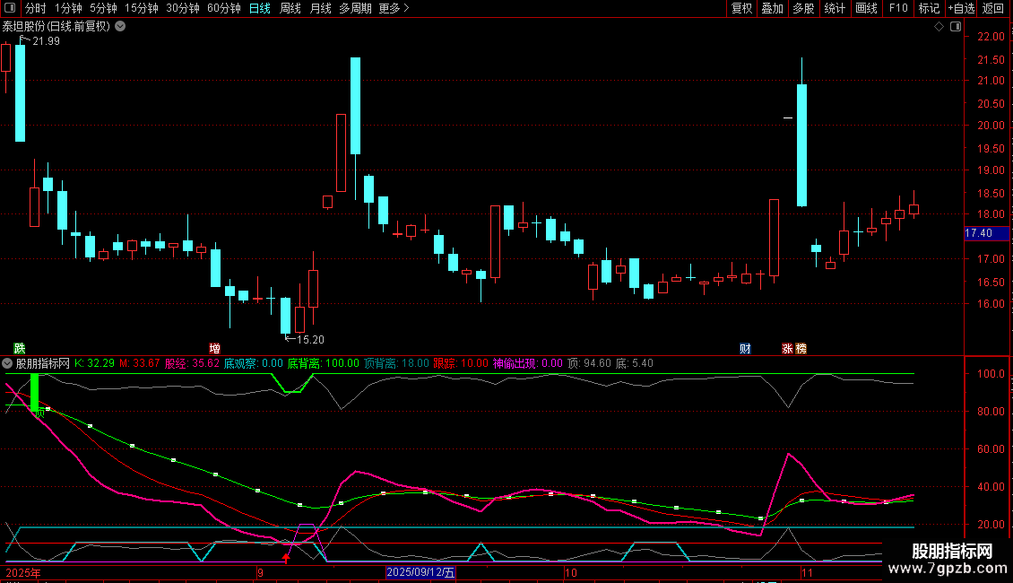顶背离: IF((VAR26>90),5,18), COLOR808000,LINETHICK2;