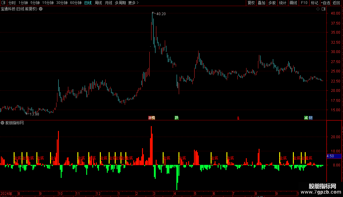 该指标通过计算收盘价与5日均线的偏离度,结合13日内高低点波动率,识别超跌反弹机会。当短期价格偏离过大且趋势线出现金叉时,触发"金底"信号,提示潜在买入时机。操作上,当"金底"信号出现且伴随趋势线低位回升时,可考虑分批建仓。