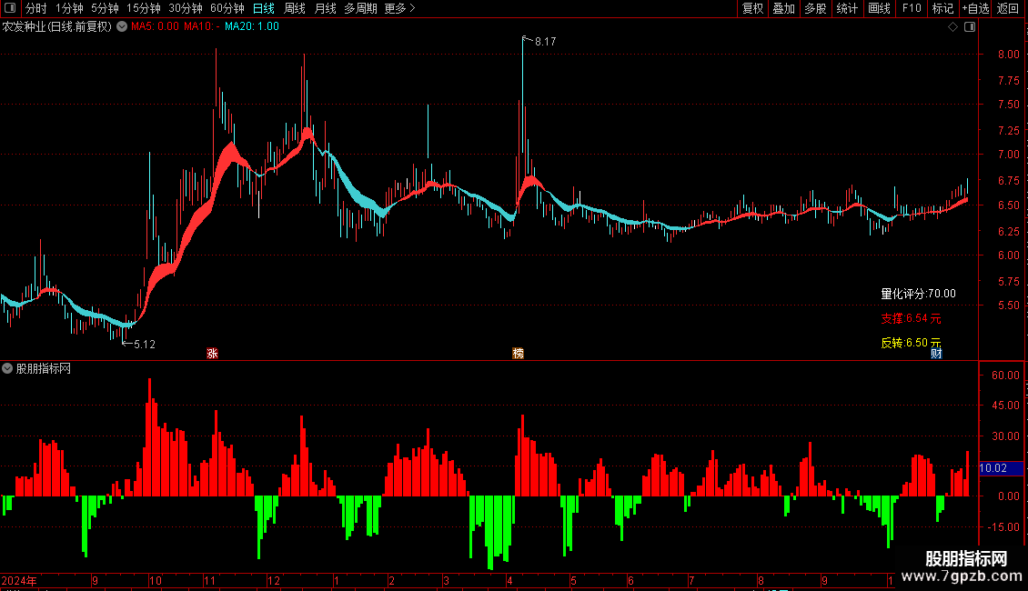 4、指标核心卖点为量化评分,范围0-90分。评分越高个股走势越强,低于50分建议观望。