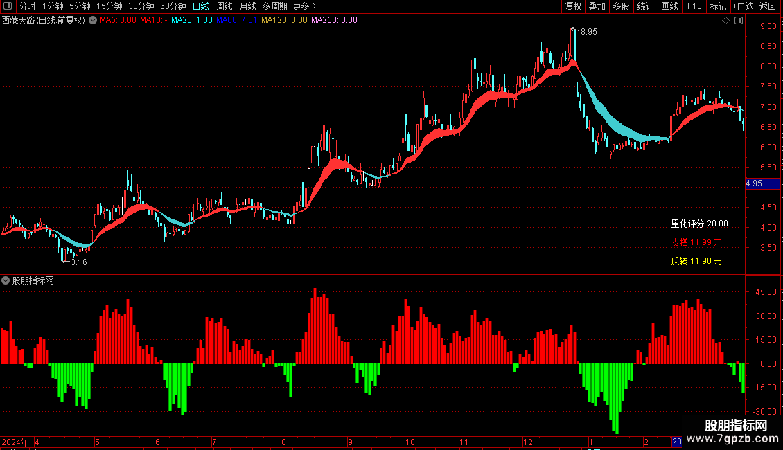 3、红色彩带为主力操盘线,彩带扩大表明多头趋势增强,应持股;彩带缩小预示多头趋势减弱,警惕多头终结。