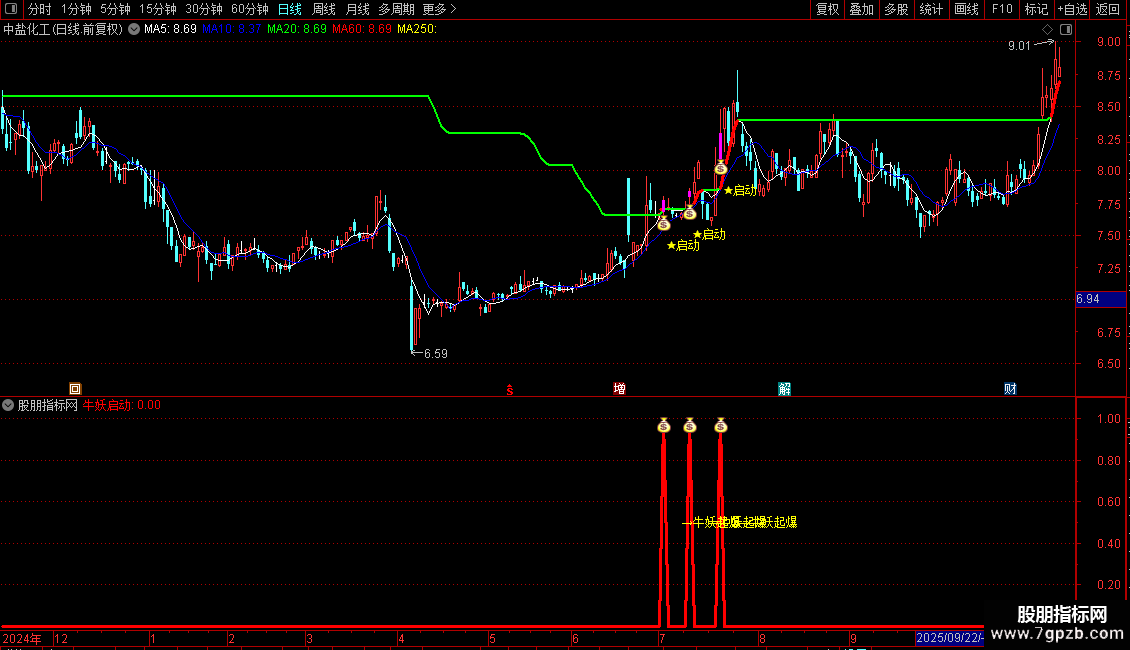 操作策略:当“牛妖启动”信号出现且当日收阳线时,视为潜在买入机会。 该信号需结合价格突破长期趋势线、特定K线组合(如前期大阳线+当前小实体阳线)共同确认。