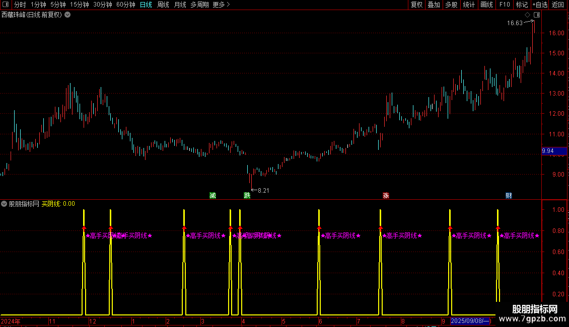 DRAWTEXT(买阴线,0.75,' ★高手买阴线★'),COLORFF00FF;