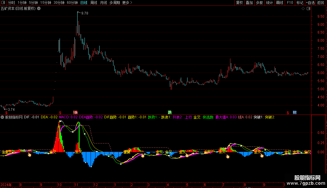 金叉:DRAWTEXT(CROSS(DIF,DEA),MACD*0.05,'金叉')COLORYELLOW;