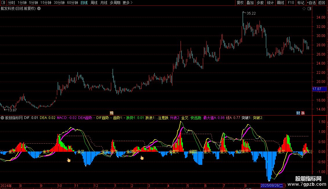 STICKLINE(MACD>=0,0,MACD,2.6,0),COLOR000095;
